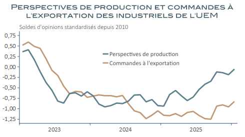 Autre particularité, les commandes et perspectives de production, en hausse, ne sont pas précédées ou accompagnées d’une amélioration proportionnelle des commandes à l’exportation. La reprise industrielle semble prendre un tour plus domestique, moins dépendant de la demande étrangère et des exportations.