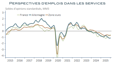 Enfin, l’activité tertiaire est à la traîne, sur fond de perspectives d’emplois en berne, assez largement en retrait de ce qui nous revient du front industriel mais bel et bien en phase avec la hausse des faillites et la déprime observée du côté des consommateurs.