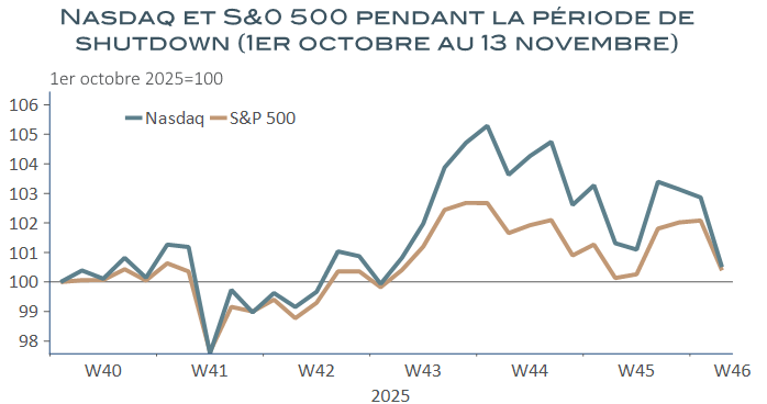 Du 1er octobre au 13 novembre : la paralysie aura duré 43 jours, la plus longue des épisodes de ce type depuis le précédent de 35 jours, du 22 décembre 2018 au 25 janvier 2019. Qu’à cela ne tienne, malgré quelques accès de faiblesse en fin de période, sans lien d’ailleurs avec la situation budgétaire, les deux indices phares de la bourse de New-York ont clôturé le shutdown avec un gain de 1 % par rapport à leurs niveaux du 30 septembre, profitant de l’épisode pour marquer de nouveaux records absolus au cours de la quatrième semaine du blocage fédéral.