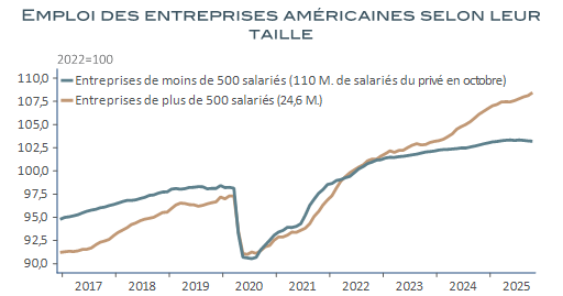 Le rapport sur l’emploi du secteur privé de l’ADP du mois d’octobre met particulièrement bien en lumière ces distorsions. Ses bons résultats d’ensemble sont venus d’une contribution exceptionnelle des établissements de plus de 500 salariés qui ont créé 75 000 nouveaux postes, un rythme particulièrement soutenu qui, bien que non inédit, fait plutôt partie des exceptions. Les entreprises de taille inférieure ont, elles, détruit 32 000 postes, après déjà 60 000 en septembre et 49 000 en août.