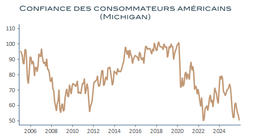 Avec plus de 80 % des salariés du privé, leurs difficultés jouent un rôle majeur sur les perspectives économiques et le sentiment des consommateurs Américains. En l’occurrence, les pertes d’emploi dans les PME n’ont, par le passé, jamais été observées en dehors des périodes de récession. On comprend mieux, dès lors, l’extrême détérioration des indicateurs de confiance des ménages, par ailleurs, impactée par un contexte inflationniste toujours éminemment négatif, notamment en ce qui concerne les prix de l’alimentation et de l’électricité.