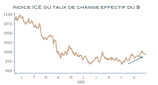 Enfin, le dollar, que beaucoup envisageaient devoir marquer le coup, a une nouvelle fois pris de court nombre de prévisionnistes, avec une appréciation de plus de 2,5 % de l’indice synthétique ICE entre le 30 septembre et le 4 novembre, à son plus haut niveau depuis le mois de mai, avant de reperdre quelques plumes dans les jours qui suivirent.