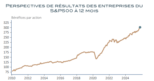 Il est vrai que du côté économique, les quelques publications de la période n’ont pas particulièrement préoccupé. Le rapport sur l’emploi privé de l’ADP a plutôt rassuré, avec des données d’octobre meilleures que celles des trois mois précédents. Les indicateurs du climat des affaires, tels que les PMI ou autres ISM, ont également bien tenu, au-delà de quelques tensions malvenues sur le front des prix, généralement interprétées comme le signe d’une bonne tenue de la demande. Enfin et, peut-être surtout, la saison des résultats des entreprises a apporté son lot de satisfaction, avec des publications souvent meilleures qu’attendu qui ont abouti à une hausse sensible des perspectives à 12 mois du consensus des analystes, en progression de 1,4 % relativement aux attentes du mois de septembre et de 14,6 % par rapport à celles du mois d’octobre 2024, leur plus forte augmentation annuelle depuis l’été 2022.