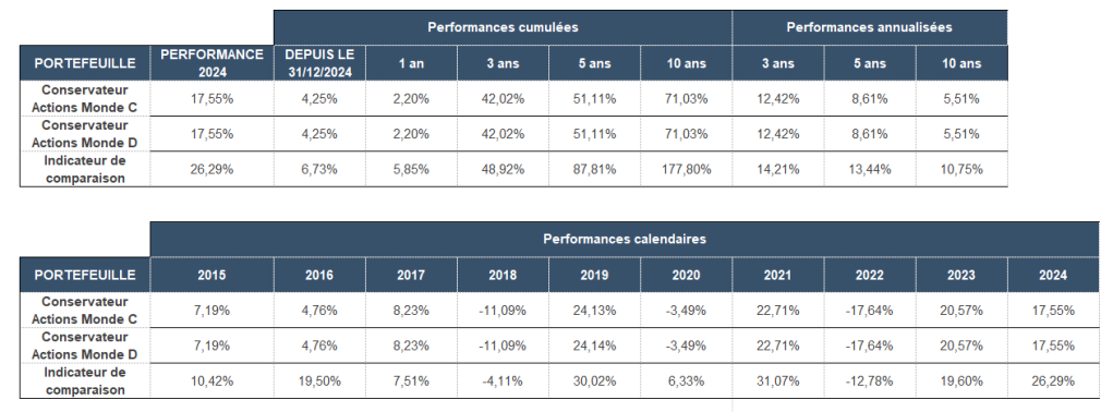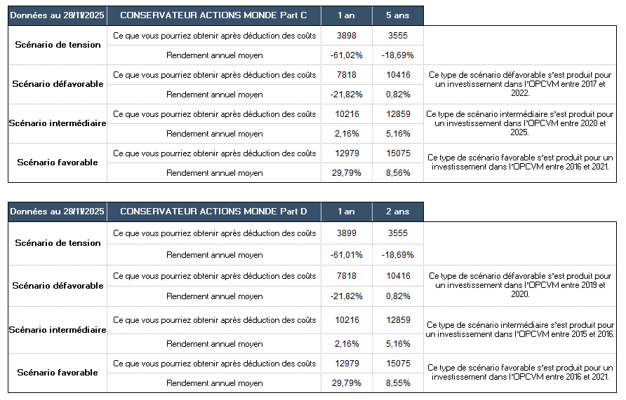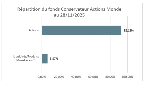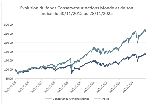 Performances en % du fonds Conservateur Actions Monde au 28 Novembre 2025 :