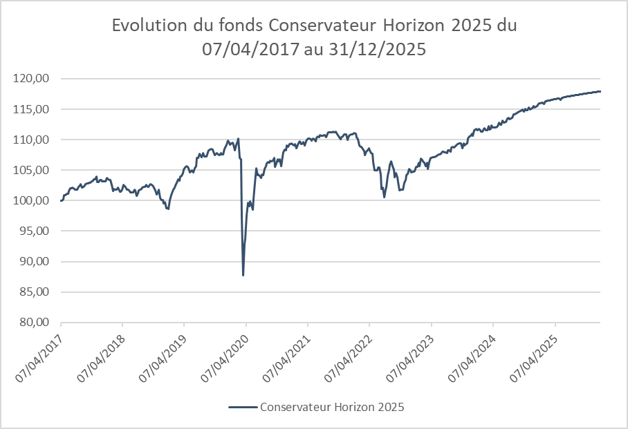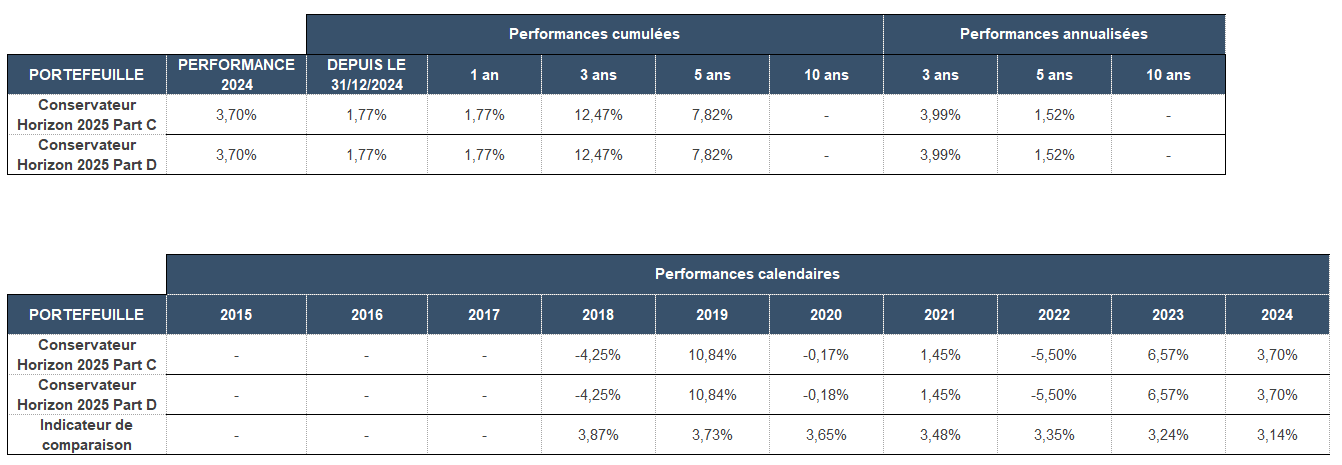 Performances en % du fonds Conservateur Horizon 2025 au 31 décembre 2025 :