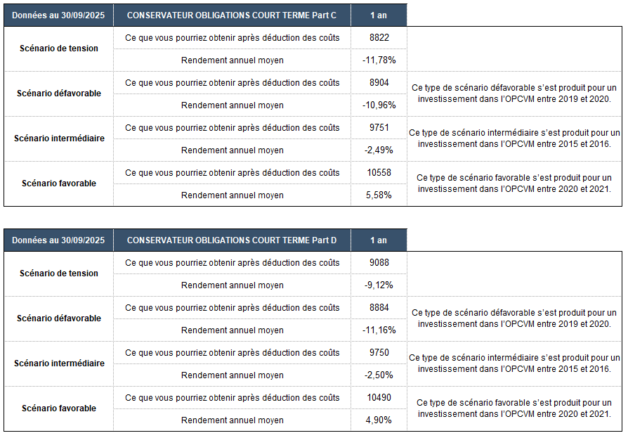 | Conservateur Obligations Court Terme D | 0,30% | 0,30% | 2,38% | 10,12% | 7,54% | 8,24% | 3,27% | 1,46% | 0,80% |