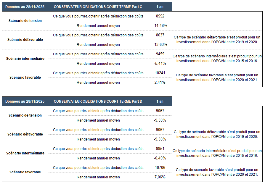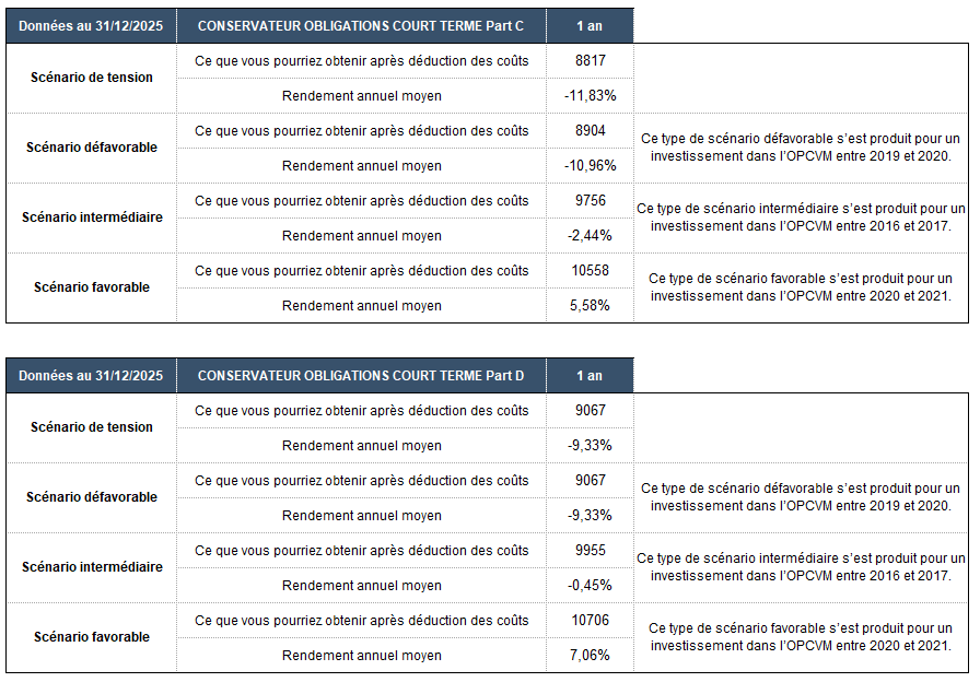 | Conservateur Obligations Court Terme D | 0,42% | -2,92% | 2,84% | -1,31% | -0,11% | -3,33% | 3,90% | 3,72% | 2,78% | 0,30% |
